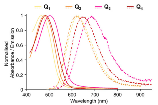 Absorption and emission spectra of FONs made from dyes Q1–Q4.