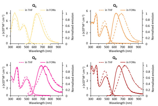 The confinement of the quadrupolar dyes within FONs leads to a slight hypochromic shift of the ICT band. We note that this effect seems more pronounced in the case of Q2 and Q4 (Figure 7). On the other hand, no sign of excitonic coupling or splitting is observed, in contrast to previous observations on different quadrupolar derivatives built from a fluorene core [11]. This suggests that the four pendant alkyl chains extending above and below the π-conjugated systems hamper such phenomenon.