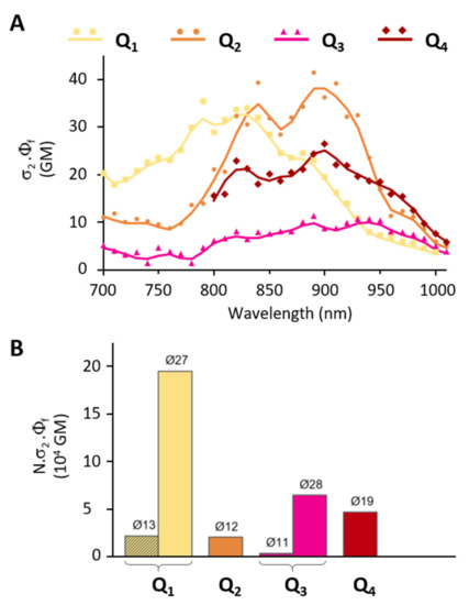 2P brightness curves σ2.Φf = f(λ) were determined by two-photon excited fluorescence (TPEF) measurements as previously described, with the appropriate solvent-related refractive index correction [40,56]. In short, samples were excited using a Ti:Sapphire oscillator (Coherent Chameleon, Nd:YVO4, 140 fs, 80 MHz) tuned from 700 nm to 1070 nm (λ) in 10 nm increments and focused onto the sample through a 10X achromatic objective (Olympus PN, NA 0.25). Except for Q4 FONs and one measurement on Q2 FONs (for which detailed information of the setup can be found in our previously published work [30]), fluorescence emission was collected at 90° using a 10X achromatic objective (Olympus UPFLN, NA 0.30) and sent on a compact USB CCD spectrometer (BWTek BTC112E) through an optical fibre. Responses were measured against either Fluorescein (10−4 M in NaOH 0.01 M from 700 nm to 1000 nm) or Nile Red (10−4 M in DMSO from 900 nm to 1070 nm) used as references. The quadratic dependence of the fluorescence intensity on the excitation power was checked at all wavelengths.