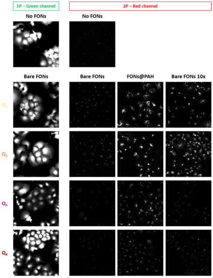 Imaging FONs in a cellular context. (Left column) Green channel collecting Calcein Green-AM fluorescence under 1P excitation; (Other three columns) Red-channel collecting FONs emission under 2P excitation, of which (Left) Bare FONs, (Middle) FONs coated with PAH and (Right) Bare FONs 10 times more concentrated during the incubation phase. Top two images were acquired on control cells not incubated with FONs (same illumination settings as for Q2 imaging—see experimental details). Images represent the maximal projection of z-stack planes sectioning through the cells’ cytosol.