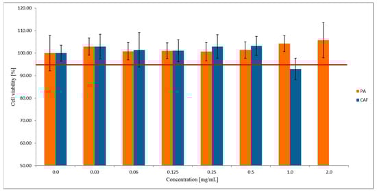 The viability of the Caco-2 cell line treated with PA and CAF. Results of the three independent replicates are presented as the mean ± SD. Acceptance criterion for the cell viability exposed for different compounds concentration has been established as 95% (red line).