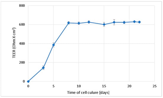Change in the transepithelial electrical resistance (TEER) over time during Caco-2 cell culture on membranes directed towards the formation of the integral intestinal epithelium. Results of the three independent replicates are presented as the mean ± SD.