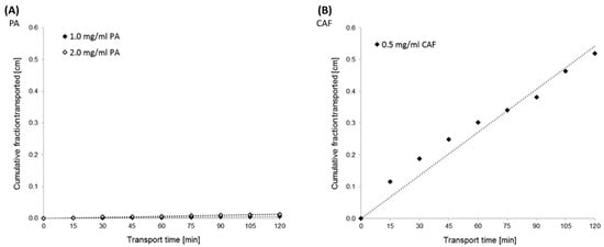 The results obtained from transport experiments showed that the permeability of PA across the Caco-2 monolayer is relatively poor. Permeability coefficients estimated for the two concentrations of PA were lower than 2 × 10−6 cm/s. The Papp values were calculated at 1.94 × 10−6 cm/s and 0.72 × 10−6 cm/s for PA at the concentrations of 2.0 mg/mL and 1.0 mg/mL, respectively (Table 1). Concomitantly, the high permeability of CAF across the Caco-2 monolayer was confirmed. CFT in the receiver compartment of the Caco-2 experimental model increased linearly with time for all tested compounds (Figure 3).