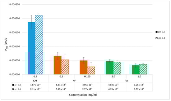 The results obtained from the transport experiments showed that the rate of transport of the compounds across the PermeaPad barrier is inversely proportional to the size of the molecules, concentration dependent, and pH-medium independent. The highest transport by passive diffusion was observed for the smallest compound, CAF (MW = 194.2), in both mediums at pH 6.8 and 7.4. The lowest permeability was observed for PA as the largest molecule (MW = 542.7), despite the highest concentrations used (2.0 mg/mL and 1.0 mg/mL). We observed a lower permeability of NF compared to CAF; however, the concentrations of NF (0.2 mg/mL and 1.0 mg/mL) were about 2.5 and 4.0 times lower than CAF. Hence, it can be assumed that the permeability of NF (MW = 473.6) across the PermeaPad barrier is relatively high (Figure 4).