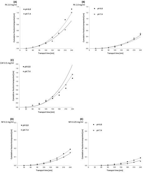 Additionally, we showed that different mediums at pH 6.8 and 7.4 did not affect PA permeability. We observed slightly lower permeability of NF in medium at pH 7.4, as compared to that of pH 6.8. However, the statistical evaluation of the transport of all compounds across the PermeaPad barrier (Student t-test) showed no significant differences in the permeability of the substances relative to the two different media at pH 6.8 and 7.4 (t-test, p > 0.05).