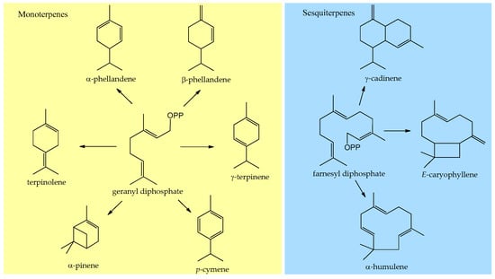 Primary mono- and sesquiterpenes arising from the geranyl and farnesyl diphosphate identified in the essential oils of Myrciaria species leaves. OPP = OPO2OPO3−3.