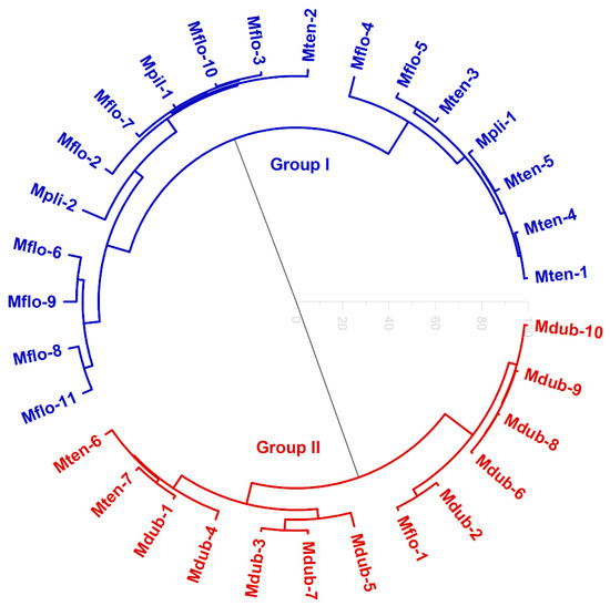 Group I was composed of M. floribunda oil samples (Mflo-2 to Mflo-11), excluding Mflo-1. This oil sample was the only one that displayed a significant amount of monoterpene hydrocarbons (78.2%). Therefore, a new chemotype is being described in this work for the first time. Likewise, M. tenella (Mten-1 to Mten-5) oil samples were associated with group I, excluding the Mten-6 and Mten-7 oils. These two oil samples were characterized by significant amounts of monoterpene hydrocarbons (Mten-6, 47.9%; Mten-7, 53.5%). Moreover, the two samples of Myrciaria plinioides (Mpli-1 e Mpli-2) were also included in group I by displaying low chemical variability, characterized by the presence of oxygenated sesquiterpenes (Mpli-1, 88.2%; Mpli-2, 24.1%).