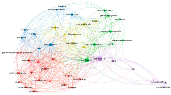 The third-largest cluster, in blue, has terms related to the chemical classes, such as “sesquiterpene” and “monoterpenes”, and terms referring to the insecticide activity, such as “insecticide” and “insect growth regulator”. The yellow cluster encompasses terms related to the extraction of essential oils, such as “distillation” and “hydrodistillation”. Finally, in purple, the fifth cluster shows terms related to the topic of this article, such as “essential oils” and “chemical variability”.