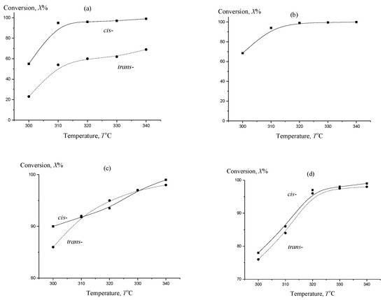 Figure 1 shows the temperature dependences of the dehydrogenation conversion of the investigated polycyclic naphthenic substrates on a 3 Pt/C catalyst. It is obvious that the presence of steric isomers with an increase in the condensation degree of the naphthenic substrates under study leads to an increase in the number of reaction routes compared with the hydrogenation process and, accordingly, to a difference in the characters of the temperature dependences of the dehydrogenation conversion. Thus, in the case of decalin, the conversion in the cis-isomer dehydrogenation in the temperature range 300–340 °C approaches the maximum values, while the highest conversion of trans-decalin in this range barely reaches 70%. At the same time, the calculation of the equilibrium constants of all elementary acts occurring during the dehydrogenation of decalin and perhydroterphenyl indicates that the cis-isomer has a tendency to transition to a more stable trans-isomer over the entire temperature range under study [18,19]. Taking into account the cis-trans transition during dehydrogenation of decalin, this leads to a decrease in the overall reaction rate and affects the completeness of hydrogen release. Because of the smaller differences in the structure of cis- and trans-conformations from linear-jointed molecules of perhydroterphenyl, dehydrogenation curves for their ortho-, meta-, and para-isomers in the investigated range of temperatures differ not so much [9,10].