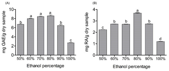 Selection of extraction system. Total polyphenols (TPC) (A), and rosmarinic acid content (RA) (B), in extracts obtained with different proportions of solvent (mg of the compound or mg of gallic acid equivalents (GAE) per gram of dry sample or extract). Statistical analysis uses a one-way ANOVA (Bonferroni test, p < 0.05). Equal letters means that there is no statistically significant difference.