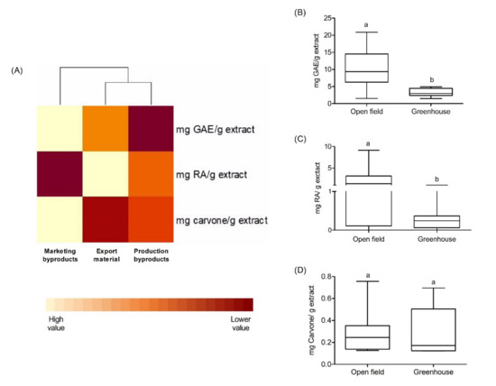 Heatmap of comparative analysis of byproducts and export material in the expression of GAE, RA and carvone (A). Box and whisker plots of the comparison of the open field and greenhouse in relation to the total phenolic content (B), rosmarinic acid (C), and carvone (D). Statistical analysis used one-way ANOVA (Bonferroni test, p < 0.05). Equal letters indicate that there is no statistically significant difference.