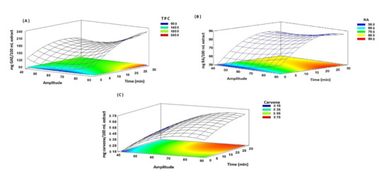 The polynomial regression model was proposed to evaluate the effect of the extraction time and amplitude factors. Three levels of amplitude (40, 65, and 90) and 9 levels for time (2, 4, 6, 8, 10, 15, 20, 25, and 30) were evaluated to obtain the compounds of interest. As a response, the TPC, RA, and carvone were expressed in terms of mg EAG, mg rosmarinic acid and mg of carvone per 100 mL of extract, respectively. Response surface and contour plots were acquired using: