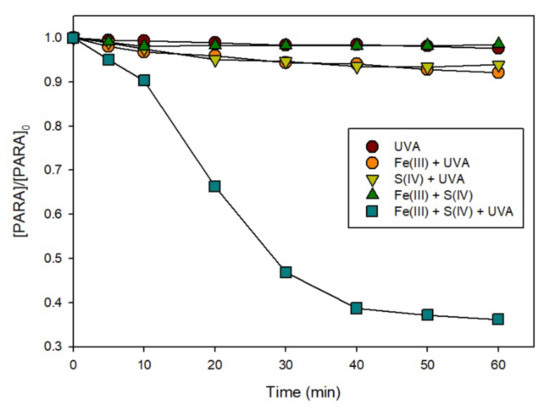 The following supporting information can be downloaded at: https://www.mdpi.com/article/10.3390/molecules27072248/s1, Figure S1: Effect of buffer on PARA degradation with UVA irradiation in aerated solutions. Conditions: [PARA]0 = 10 μM, [S(IV)]0 = 1.0 mM, [Fe(III)]0 = 0.1 mM, pHinit = 7.0. Figure S2: Effect of S(IV) concentration on PARA degradation with UVA irradiation in aerated solutions. Conditions: [PARA]0 = 10 µM, [Fe(III)]0 = 0.1 mM, pHinit = 7.0. Figure S3: Effect of Fe(III) concentration on PARA degradation with UVA irradiation in aerated solutions. Conditions: [PARA]0 = 10 µM, [S(IV)]0 = 1.0 mM, pHinit = 7.0.