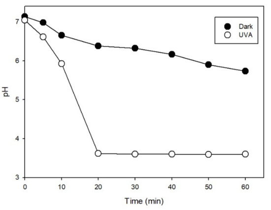 The degradation mechanism was initiated by the Fe(III)/S(IV) complex formation (FeSO3+) [8,9,10,11], which then underwent ligand-to-metal charge transfer (LMCT) reaction [12] to generate SO3•− [13]. On the other hand, monitoring of the pH during the reaction revealed a much greater decrease under irradiation, as shown in Figure 2. The pH decreased slightly during the initial stage of the reaction and then decreased sharply between 10 and20 min. Moreover, the rate of PARA degradation (Figure 1) varied in the same way as the decrease in pH. The results indicate that irradiation can enhance the reaction in the Fe(III)/S(IV)/O2/UVA system, lowering the pH from near-neutral to moderately acidic (pH 3.5).