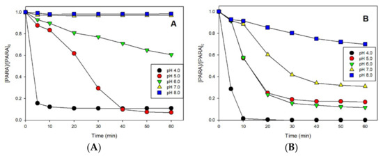 To determine the effect of pH on the degradation of PARA, samples were analyzed at initial pH values ranging from 4.0 to 8.0, under dark and irradiation. Figure 3A shows that, without irradiation, the efficiency of PARA degradation decreased with increasing initial pH. With an initial pH 6.0, the degradation efficiency of PARA was only 39% after 60 min of reaction. When the initial pH of the solution was ≥7.0, there was no PARA degradation. Corresponding experiments were performed under UVA irradiation in the same pH range of 4.0 to 8.0. As shown in Figure 3B, the efficiency of PARA degradation also decreased with increasing pH. However, the reaction proceeded at pH 7.0, and after 60 min, the degradation efficiency reached around 69%. At pH ≥ 8.0, PARA degradation was still evident, with more than 25% of disappearance after 60 min of irradiation. Comparing the efficiencies of PARA degradation with or without irradiation, the reaction rate under irradiation was very fast and complete degradation was achieved at pH 4.0, whereas it proceeded to a lower extent in the dark. This result is consistent with earlier reports by our group of greatly enhanced rates of contaminant degradation with the Fe(III)/S(IV) system [9,14,15] under irradiation. In the range of pH tested, the optimum initial pH of the Fe(III)/S(IV) system is 4.0. When the initial pH of the solution was increased to 5.0, the initial reaction rate of PARA degradation under irradiation was much faster than that without irradiation, but after 60 min, the degradation efficiencies were comparable. This was due to the decrease in pH, which enhanced the reaction. However, at pH > 6.0, the difference between PARA degradation with or without irradiation became much more marked. For example, at pH 6.0, the degradation efficiencies were around 39% and 83% without and with irradiation, respectively. This result corroborates that irradiation greatly enhances the reaction, which can be explained by the associated decrease in pH to acidic values. This phenomenon implies that photodegradation of organic compounds should be considered as an important pathway in media at near-neutral pH.