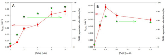 First order rate constant of PARA degradation (kPARA) (filled circles) and degradation efficiency in percentage after 60 min (green stars) as a function of S(IV) (A) and Fe(III) (B) concentrations under UVA in aerated solutions. Conditions: [PARA]0 = 10 μM, [Fe(III)]0 = 0.1 mM, [S(IV)]0 = 1.0 mM, pHinit = 7.0.