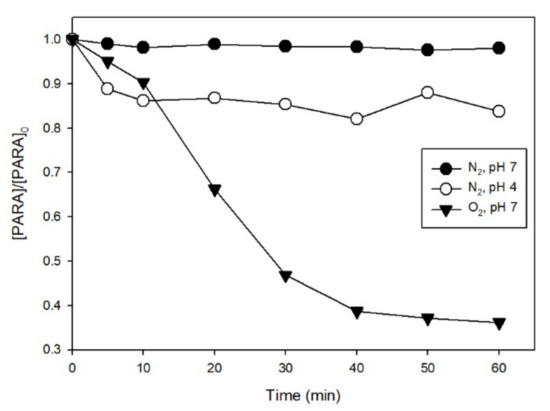 The effect of oxygen on the degradation of 10 µM PARA was studied using 0.1 mM Fe(III) and 1.0 mM S(IV) at both pH 4.0 and 7.0 under UVA irradiation. As shown in Figure 5, in de-aerated solutions, there was almost no degradation at pH 7.0 and only a 16% loss of PARA at pH 4.0 after 60 min of irradiation. This percentage of PARA degradation is much smaller than the 64% loss at pH 7.0 and complete degradation at pH 4.0 obtained in aerated solutions (Figure 3B). The results show oxygen level to be a very important parameter affecting the photodegradation of PARA in the Fe(III)/S(IV)/O2/UVA system at different pH. Thus, we surmise that oxygen takes part in the photochemical process in this system. The role of oxygen is to generate SO4•− and SO5•− in solution by reaction with SO3•− (R5–9), and the observation that there is still some degradation of PARA at pH 4.0 without oxygen can be ascribed to the generation of some hydroxyl radical (HO•) at pH 4.0 under irradiation (R11) [18,19,20].