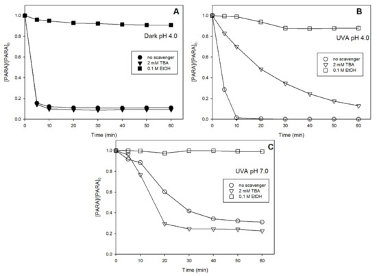 At pH 4.0, under dark condition in Figure 6A, almost no effect of TBA was observed, while complete PARA degradation inhibition occurred in the presence of EtOH, indicating that mainly SO4●− was generated in this system. However, under UVA (Figure 6B), the degradation of PARA was partially inhibited, also in the presence of TBA, suggesting the generation of both radicals HO● and SO4●−.