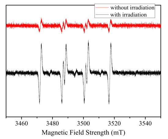 To gain further evidence for the mechanism in the Fe(III)/S(IV)/O2/UVA system, ESR spectra were recorded to identify radical intermediates formed during reactions of Fe(III)/S(IV) using DMPO as a spin trap. SO4•− and HO• were detected by measuring the signals of their respective DMPO−HO• and DMPO−SO4•− adducts, as described previously [24,25]. As shown in Figure 7, for the Fe(III)/S(IV)/UVA system, the hyperfine coupling constants in the measured spectra were consistent with those of DMPO–SO3•− adducts, and no DMPO−OH adducts were detected. These observations confirm that the HO• concentration is insignificant under these conditions and that SOx•− (including SO3•−, SO4•−, and SO5•−) are the primary reactive oxidants responsible for PARA degradation. However, in the absence of DMPO and in the presence of oxygen, SO3•− can be easily oxidized to SO5•− (R5), thereby considerably mitigating the contribution of SO3•− in our system. Combining the results of the radical scavenger experiments, the fact that EtOH can completely inhibit the reaction and its negligible reactivity with SO5•− (<1 × 103 M−1 s−1) [26], it can be concluded that, in the Fe(III)S(IV)/O2/UVA system, SO4•− is the oxidant that is mainly responsible for the degradation of PARA.