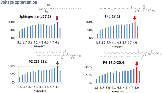 Exemplary plots showing the optimization of voltage for untargeted lipidomic analysis with use of IPA:MeOH, 1:3, v/v with 10 mM ammonium acetate and 1 mM acetic acid. Four analytical standards were used to optimize the desorption solvent: PG (17:0–20:4), PC (C16–18:1), LPE (17:1), and Sphingosine (d17:1). The red arrows indicate voltage selected for further experiments.