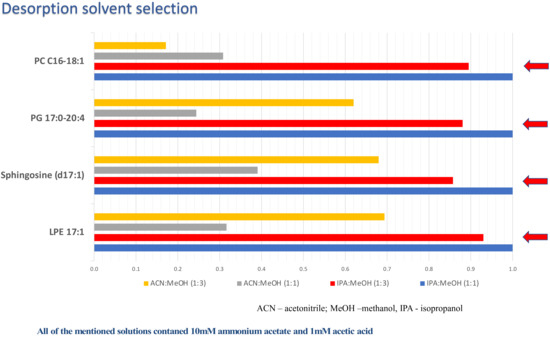 Plots presenting the optimization of desorption solvent for untargeted lipidomic analysis. Four analytical standards were used to optimize the desorption solvent: PG (17:0–20:4), PC (C16–18:1), LPE (17:1), and Sphingosine (d17:1). Acetonitrile:methanol (1:1), acetonitrile:methanol (1:3), isopropanol:methanol (1:1), and isopropanol:methanol (1:3) solutions all contained 10 mM ammonium acetate and 1 mM acetic acid was tested as a desorption solution. The red arrows indicate the desorption solvent selected for further experiments.