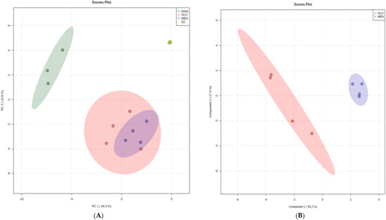 Data acquisition was performed using Xcalibur v. 4.2 software (Thermo Fisher Scientific, San Jose, CA, USA). The data for the lipidomic studies were processed using LipidSearch v. 4.1.30 software (Thermo Fisher Scientific, San Jose, CA, USA), with the accuracy set to 3 ppm and the intensity threshold set to 100,000. The searched ion adducts consisted of H+ and NH4+. An m-score of 10 and a retention time tolerance of 0.25 min. were used as the alignment settings and based on extraction quality control (QC), and the results were filtered using the following parameters: a coefficient of variation (CV) below 30 and not equal to 0. After the results had been filtered, the peak areas for all tentatively detected lipids were normalized on the summary peak area. Multivariate statistical analysis was performed using the online Metaboanalyst software package [33], with missing values being estimated and replaced by small numbers (i.e., half of the minimum positive values in the study data). Logarithmic transformation and autoscaling were also applied. Finally, two multivariate approaches, principal component analysis (PCA) and partial least squares discriminant analysis (PLS-DA), were also employed. The selection of lipids for PLS-DA analysis was based on a VIP score greater than 1.0.
