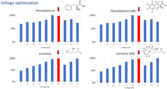 Exemplary plots showing the optimization of voltage for targeted analysis with the use of ACN:H2O, 95:5, v/v. Four analytical standards—phenylalanine, phenylalanine(d8), L-carnitine inner salt, L-carnitine(trimethyl-d9)—were used to optimize the desorption solvent: The red arrows indicate the voltage selected for further experiments.