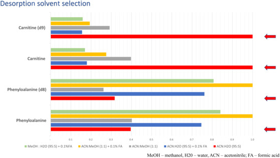 Prior to the analysis of real samples, the optimal voltage and desorption solvent were selected. Thus, five different desorption solvents spiked with L-carnitine(trimethyl-d9), L-carnitine, phenylalanine, and phenylalanine(d8) were tested. The voltage range of 4.0 to 4.9 kV was studied and the results of voltage optimization for acetonitryle:water, 95:5, v/v solution as an exemplary plot are presented in Figure 4. To select the best desorption solvent for carnitine, peak areas of the spiked standard were compared (Figure 5) and an acetonitrile:water (95:5) mixture was selected as the optimal solution for carnitine analysis.