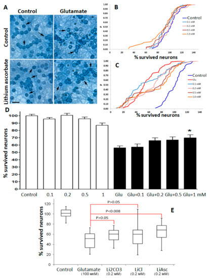 A glutamate stress model evaluated the synthesized lithium ascorbate substance in neurocytological studies on cultured cerebellar granular neurons (CGN). Studies have shown that lithium ascorbate was more effective in supporting neuronal survival than lithium chloride or lithium carbonate in the 0.1–1.0 mM concentration range. At the same time, for lithium chloride and for lithium carbonate, a significant dispersion of the values of neuronal survival was observed, which did not allow us to register any statistically significant differences when compared to the control.