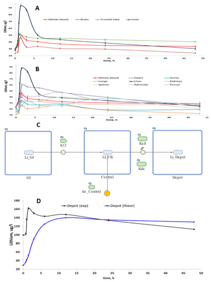 One-, two-, three- and four-compartment models in various configurations were investigated. As a result of modeling, it was found that the simplest model that most accurately described the studied PK curves was a three-chamber model, which included the gastrointestinal tract (first compartment), whole blood (central, second compartment) and lithium depot (third compartment). Moreover, in this model of the best quality possible (for the data collected), the elimination of lithium was carried out from the central compartment and not from the depot or the first compartment (Figure 2C). The quality of the investigated multi-compartmental models was characterized by the values of the standard deviation of concentrations between the theoretical and experimentally obtained PK curves (a = 3.4 μg/L with a correlation coefficient of 0.92.