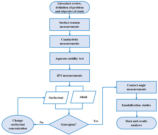 The methods deployed in this study include surface tension and conductivity measurements to study the aggregation behaviors and surface activities of the surfactants. The aqueous stability test (i.e., compatibility with brine) was conducted to evaluate the tolerance of the various chemical agents and their combinations to hardness. The interfacial properties and wettability alteration of the surfactants, alkalis and their combination were investigated through IFT and contact angle measurements, respectively. Then, the final step was an emulsification test to corroborate the interfacial properties. Figure 3 shows a flow chart of the experimental methods used in this study.
