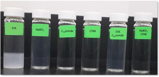 The compatibility of alkalis, surfactants and AS formulations with brine is shown in Figure 6. The ETA was incompatible with brine, while NaBO2 formed a stable and clear solution with brine. With higher divalent cation concentrations, the hardness tolerance of ETA is exceeded. The ethanolamines, diethanolamine and triethanolamine are more tolerant to hardness than ETA [56]; nevertheless, ETA has been proven to have a better synergistic effect with the surfactant in IFT reduction [12]. Therefore, ETA was the choice for this study among the ethanolamines. NaBO2, on the other hand, is known to sequester divalent ions [57,58]. C16mimBr and CTAB were not expected to form a precipitate with brine, since they are cationic surfactants [14]. Both the combination of ETA with C16mimBr and NaBO2 with CTAB formed a clear solution with brine. Therefore, no precipitations and formation damage are expected in their flooding process.