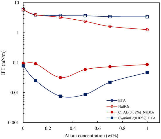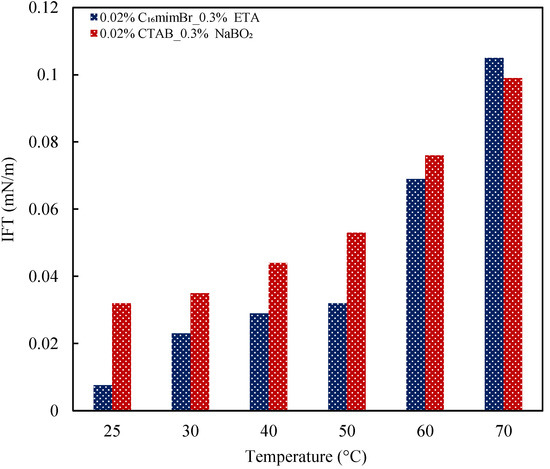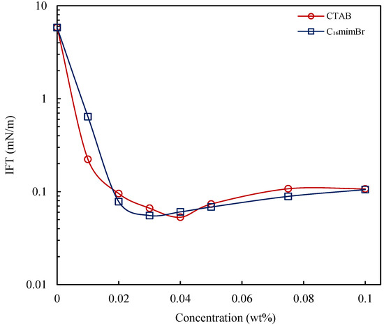 IFT reduction is known to be a predominant mechanism in the application of the surfactant and alkali for enhancing oil recovery. The interfacial properties of these chemical agents are therefore vital in developing an optimum formulation for improving oil recovery. Herein, the performance of the ETA–C16mimBr combination in reducing IFT is evaluated in comparison to a NaBO2–CTAB combination, both in a deionized water and brine solution. The effect of temperature is evaluated as well. The IFT reduction capability of C16mimBr is first compared to CTAB, as presented in Figure 7. C16mimBr had a similar IFT reduction capability as CTAB, with a minimum IFT (IFTmin) of 0.055 mN/m (at 0.03 wt% C16mimBr concentration), and CTAB had an IFTmin of 0.053 mN/m (at 0.04 wt% CTAB concentration). This observation confirms their surface activity, as explained in Section 3.1. C16mimBr attains IFTmin at a lower concentration, owing to the facilitated micellization process. Due to the delayed micellization in CTAB, there more surfactant molecules available at the oil–water interface to reduce IFT further. The predominant surfactant feature that enhances the IFT reduction capability is the alkyl chain length [40]. The two cationic surfactants have the same alkyl chain length, which masks the difference in the interfacial properties caused by the differences in their headgroups, hence the similarities in their interfacial properties.