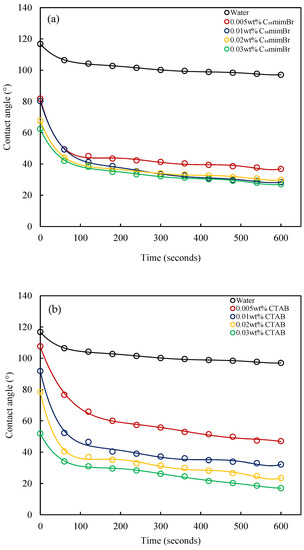 The dynamic contact angle at various concentrations for C16mimBr and CTAB is shown in Figure 12. From both figures, it is observed that the contact angle of water varies from 116° to 97° in 10 min. This means the carbonate surface is wet with oil. From Figure 12a, it is observed that the contact angle decreases significantly with the increasing C16mimBr concentration. Beyond a 0.01 wt% concentration, the decrease in the contact angle becomes marginal. However, for the CTAB solutions (Figure 12b), the contact angle reduced further with the increasing CTAB concentration. Comparing the initial and final contact angles at various concentrations for C16mimBr and CTAB, it is apparent that the CTAB solutions exhibited better wettability alteration capabilities than C16mimBr. The surface activity study showed that CTAB has a higher Γm, which means more surfactant molecules are available at the solid–liquid interface to alter the rock surface wettability. Both surfactants have positive headgroups, and with the positive charge surface of carbonate, the observed wettability alteration is mainly attributed to the ion pair mechanism. The negative components of crude oil, predominantly fatty acids and carboxylate anions, adsorb onto the positive surface of carbonate and render it wet with oil [70]. The positive headgroups of C16mimBr and CTAB form ion pairs with the negative crude oil component adsorbed on the carbonate surface and detach them, leaving the rock surface wet with water [33].