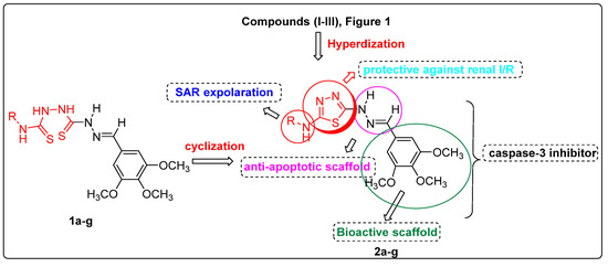 Because of the emergence of acute renal ischemia and its ongoing impact on the global health system, there has been a growing interest for the development of novel antiapoptotic agents in order to combat this disorder. Thus, we report here our medicinal chemistry efforts, starting with the core scaffold of the caspase inhibitor that led to the design and synthesis of new thiadazole analogues as simpler and more efficient antiapoptotic compounds (Figure 2). Moreover, the aim of this study is to test the activity of the cyclized thiadiazole derivatives 2a–g in comparison to their corresponding opened hydrazine-carbothioamides 1a–g in terms of screening antiapoptotic activity, molecular modelling studies, and caspase-3, 8, and 9 inhibition assays to study the plausible mechanism of action of the newly synthesized compounds (Figure 2).