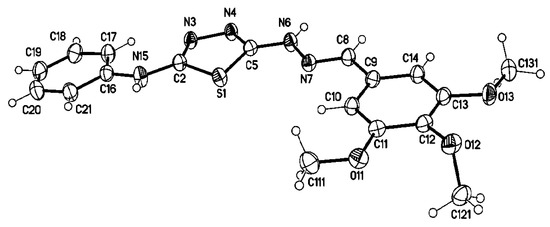 The E-form of compounds 2a–g was proved from X-ray structure analysis of (E)-N-phenyl-5-(2-(3,4,5-trimethoxybenzylidene)hydrazinyl)-1,3,4-thiadiazol-2-amine (2d) (Figure 3). Tables of X-rays are shown in Figures S1-S7 in Supplementary Data.