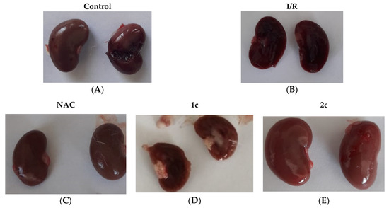 Photos of kidneys for groups of control (A), I/R (B), reference (NAC) (C), and treated with compounds 1c (D) and 2c (E), as concentrations were measured in serum to detect renal injury due to ischemia/reperfusion (I/R).