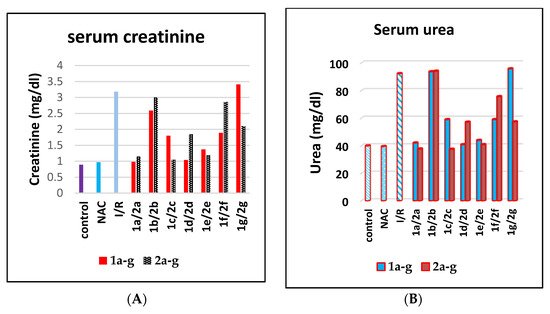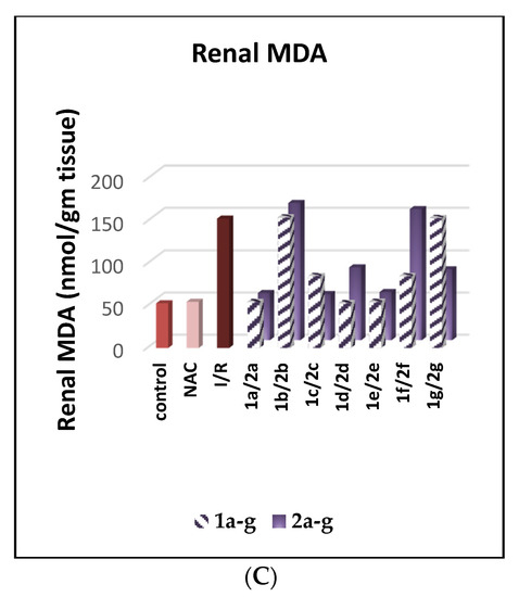 The present study was performed to investigate the validity of serum creatinine levels as an indicator of postischemic renal dysfunction in mice [65]. The results show that the cyclized compounds 2c and 2g had excellent serum creatinine, serum urea, and renal MDA inhibition effects with conc 1.05 and 2.1 mg/dL (creatinine); 37.41 and 57.28 mg/dL (urea); and 54.55 and 84.01 nmol/gm (tissue) (renal MDA), which were respectively better than their corresponding opened intermediates 1a and 1g of conc 1.8 and 3.41 mg/dL (creatinine); 58.87 and 95.69 mg/dL (urea); and 85.48 and 154 nmol/gm (tissue) (renal MDA) and better than those, respectively, in comparison to NAC (3.18 mg/dL for creatinine, 92.17 mg/dL for urea, and 153.1 for renal MDA) (Figure 5).