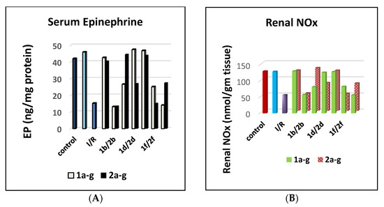 The assay of activation parameters (serum epinephrine, renal NOx, and serum TAC) was conducted for the treated groups of opened 1a–g and cyclized compounds 2a–g in comparison with sham and NAC, and the results are outlined in Tables S8–S11 (supplementary data). Both cyclized compounds 2c and 2g had excellent epinephrine activation effects with 44.51 and 27.39 ng/mg protein, respectively, in comparison with their corresponding opened intermediates 1a and 1g of conc 26.58 and 14.05 ng/mg protein, as illustrated in Figure 6 and Tables S8–S11 (Supplementary Data).