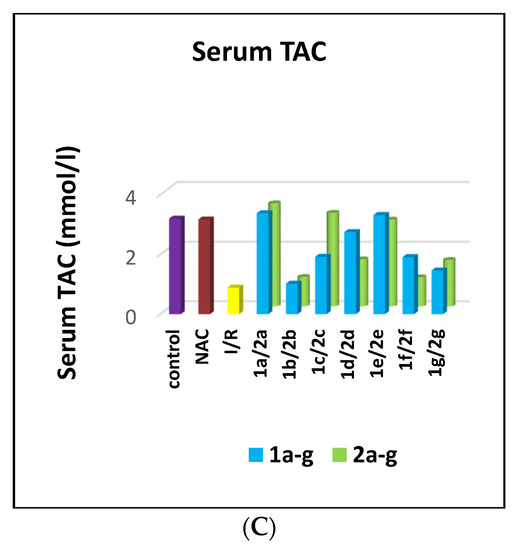 Tables S8–S11 (Supplementary Data) indicate that I/R, 1b, 1g, 2b and 2e groups displayed significant increases in serum creatinine and urea and significant decreases in EP when compared to control and NAC groups. Meanwhile 1a, 1c, 1d, 1e, and 1f groups displayed significant decreases in creatinine and urea and significant increases in EP when compared to the I/R group. The same table lists that groups I/R, 1b, 1c, 1f, 1g, 2b, 2c, 2e, and 2f had a significant increase in MDA along with a significant decrease in NOx and TAC when compared to control and NAC groups. Groups 1a, 1d, and 1e showed significant improvements in oxidative stress parameters when compared to the I/R group. On the other hand, groups 1c and 1f showed significant results in MDA, NOx and TAC when compared to I/R group.