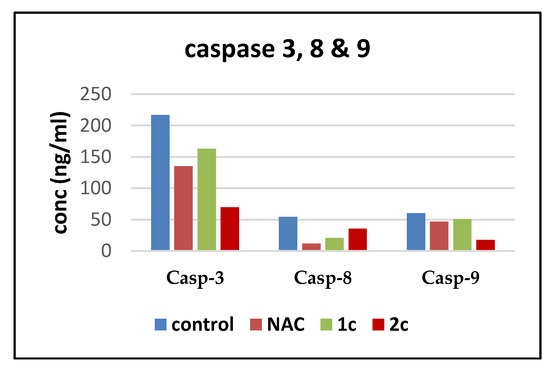 Results indicate that compound 2c showed downregulation in the level of active caspase-3 and caspase-9 with conc = 69.77 and 17.58 ng/mL (fold change = 3.1, 3.41), which was better than 1c with conc = 163.1 and 50.6 ng/mL (fold change = 1.33, 1.19), respectively, and better when compared to NAC (conc = 135.2, 46.83 ng/mL, respectively), as shown in (Table S12, Supplementary Materials).