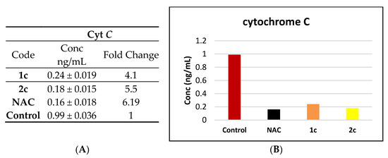 Effects of compounds 1c, 2c, and NAC on ((A) fold change) alongside conc (ng/mL (B)) conc of cytochrome C in SR human cell line.