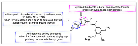 It can be concluded from the previous results that cyclized thiadiazoles heterocycles showed antiapoptotic activity better than their corresponding opened hydrazinecarbothioamides. It is noted that thiadiazoles of 3–5 carbon chains, such as 2c and 2g which were substituted with saturated alicyclic (cyclopropyl) or aliphatic groups (pentyl), showed the highest activity, but there was activity to a lesser extent when substituted with carbons chain <3, carbons as an ethyl group (compound 2b), cyclohexyl (compound 2e), or an aromatic benzyl group (compound 2a) (Figure 9).