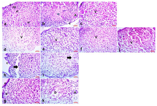 Photomicrographs of the supra renal tissue of (a) Sham group showing adrenal gland covered by a connective tissue capsule (C). Beneath the capsule, the cells of the zona glomerulosa (Zg) are seen. The next wider zone is the zona fasciculata (ZF) with a regular arrangement of its cells and the zona reticularis (zr). (b) Model group showing distorted zones with degeneration (star) with a dilated artery (A). (c) Reference group showing amelioration of all zones, but vacuolations could be seen in most sections (V). (d–j) groups 1, 3, 5, and 6 showing apparent normal supra renal tissue, but vacuolations can still be seen (V). Few dark, dense nucleoli (arrows) could be detected (arrow). (h,i) Drug 4 and 7 showing moderate thicken capsule (c) with some areas appear with tissue lost (arrows). Notice the more observable apoptotic cells (arrows). (g,k) Groups 2 and 8 showing severe damage to the suprarenal tissue (D). Notice the thicken capsule (c) and the dilated blood (a). Notice the more notable apoptotic cells (arrows). H & E, × 400.