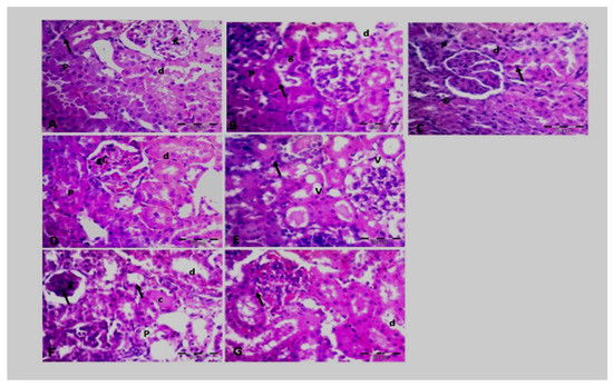 Photomicrographs of renal cortex of (A–C): groups 4, 6, and 8, respectively, showing renal tissue nearly approach normal; renal glomerulus (g), proximal convoluted tubules (PCT), and distal convoluted tubules (d) except for a few dark dense nucleoli (arrows) could be detected in previously structures. (D,E) (10 and 7, respectively) showing globular congestion (gc) and both tubular and globular vacuolation (V). Notice the more notable apoptotic cells (arrows) than the previously mentioned drugs. (F,G) groups (5 and 9, respectively) showing shrunken glomerulus (g), intratubular hyalin cast (c), dilated tubules (p,d) and more observable apoptotic cells (arrows). H & E, × 400.