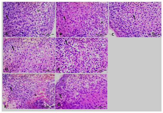 Photomicrographs of the supra renal tissue of (A–C): groups 4, 6, and 8, respectively, showing apparent normal supra renal tissue, but vacuolations could still be seen (V). Few dark, dense nucleoli (arrows) could be detected (arrow). (D,E) Groups 10 and 7, respectively, showing moderate thickened capsules (c). Notice more notable apoptotic cells (arrows) than previously mentioned drugs. (F,G) groups 5 and 9 respectively showing severe damage to the suprarenal tissue (D). Notice the thicken capsule (C) and the hemorrhage (h). Notice the more observable apoptotic cells (arrows). H & E × 400.
