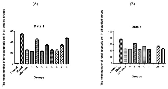 Histogram showing the mean number of (A) renal apoptotic cells in all studied groups; and (B) supra renal apoptotic cells in all studied groups. Results represented by the mean ± SE (n = 8).