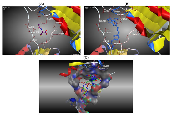 The MOE® Dock program was used for performing the molecular docking for compounds under investigation. All tested compounds docked into the binding pocket of the active site of caspase-3 (PDB: 1RHJ) to investigate the docking fitness scores of bioactive conformations and their specificity for the caspase-3 enzyme. The docking reliability was validated using the known X-ray structure of caspase-3 in a complex with PZN. The ligand PZN was extracted from the complex, and the ligand NAC was re-docked to the binding site of caspase-3 (Figure 15). The top-ranked conformation of each compound was selected on the basis of docking score. The docking scores of the studied compounds are shown in Table S13 (Supplementary Data).