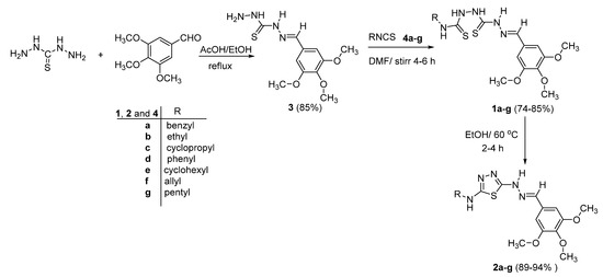 3,4,5-Trimethoxybenzylidenethiocarbonohydrazide (3) was prepared according to the published literature [69]. A mixture of 3 (1 mmol) in dry DMF (30 mL) and 1 mmol of substituted isothiocyanates 4a–g was stirred at room temperature for 4–6 h (the reaction was monitored by TLC). After reaction completion, the reaction mixture was poured onto a mixture of crushed ice and water with vigorous stirring. The precipitated solid was filtered, washed with water, dried, and recrystallized from ethanol to afford compounds 1a–g. Substituted-2-(2-(3,4,5-trimethoxybenzylidene)hydrazinecarbonothioyl)hydrazinearbothioamide 1a,b,d–g were prepared according to the literature’s method [70].