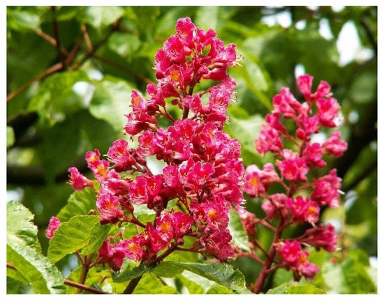 Our experiment focused on two Aesculus species: Aesculus hippocastanum (horse chestnut) and Aesculus (×) carnea (red horse chestnut). The first is characterized by white flowers with small red spots (Figure 4), and the second species has pink flowers (Figure 5). Our experiment was conducted over two years, 2018–2019. Flowers of both species were collected in the morning from six independent trees located in Warsaw parks and green areas between 1 and 4 of May each year and the samples were quickly transported to the laboratory. The location of trees was: Lazienki Park (52°22″ N; 21°03″ E), Saski Park (52°14″ N; 21°0″ E), Królikarnia Park (52°41″ N; 21°42″ E), Mokotowskie Pole Park (52°21″ N; 20°99″ E), Sowiński Park (52°23″ N; 20°95″ E), Szczęśliwicki Park (52°21″ N; 20°96″ E).
